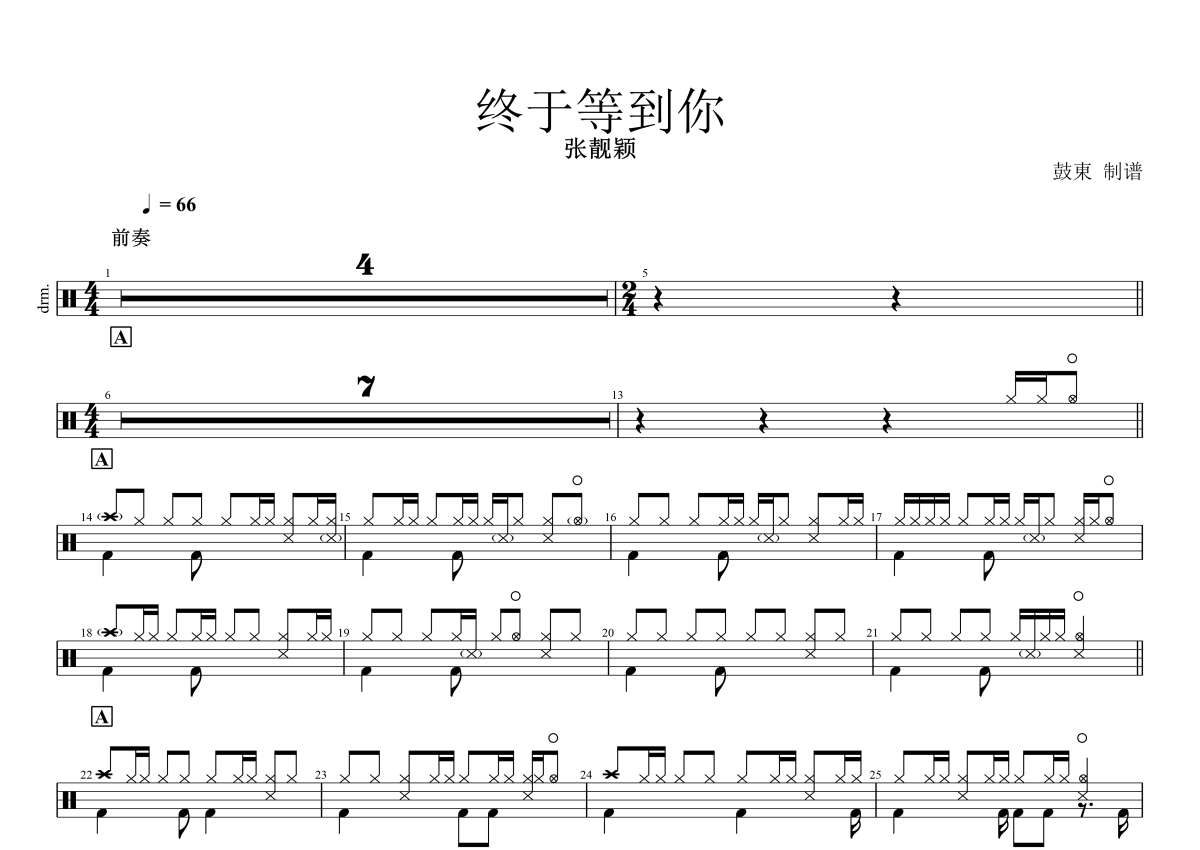 《终于等到你》是张靓颖演唱的一首歌曲,这份架子鼓谱共有两张高清图谱,图谱由 @小东鼓谱 编配上传,图谱使用五线谱编配,使用这份终于等到你架子鼓谱,你将能够轻松地敲打出这首张靓颖的终于等到你,快来尝试吧。