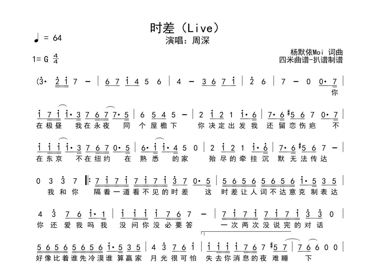 《时差》是周深演唱的一首歌曲,拍号为4/4拍,这份简谱共有一张高清图谱,图谱由 @SRV7758521 编配上传。