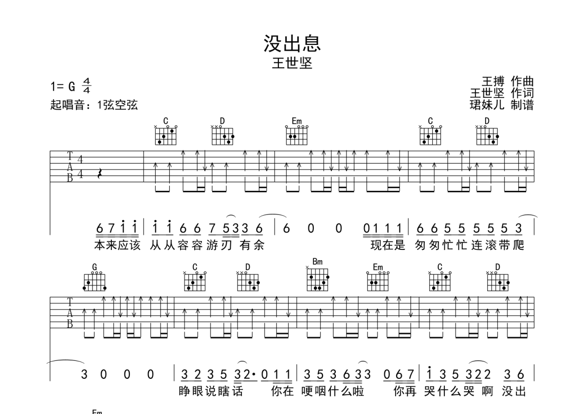 王世坚《没出息》吉他谱 - G调弹唱六线谱