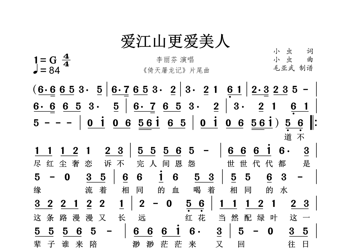《爱江山更爱美人》是李丽芬演唱的一首歌曲,拍号为4/4拍,这份简谱共有两张高清图谱,图谱由 @秋天的童话 编配上传。