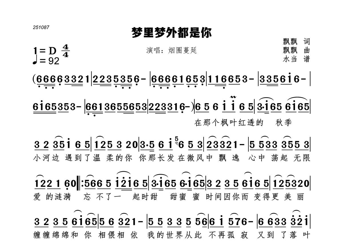 《梦里梦外都是你》是烟圈蔓延演唱的一首歌曲,歌曲速度为每分钟92拍,这份简谱共有一张高清图谱,图谱由 @水当 编配上传。