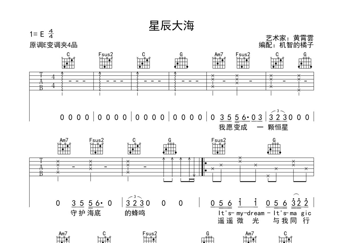 《星辰大海》是黄霄雲演唱的一首歌曲,本吉他谱采用的是C调指法编配,这份吉他谱共有两张高清图谱,图谱由 @机智的橘子 编配上传,图谱使用六线谱编配,包含吉他和弦指法、简谱以及歌词部分,曲谱配备了相关的音频提供试听,使用这份星辰大海吉他谱,可以让你更加方便地掌握这首歌曲的弹唱技巧,快来尝试吧。黄霄雲《星辰大海》吉他谱_C调吉他弹唱谱。