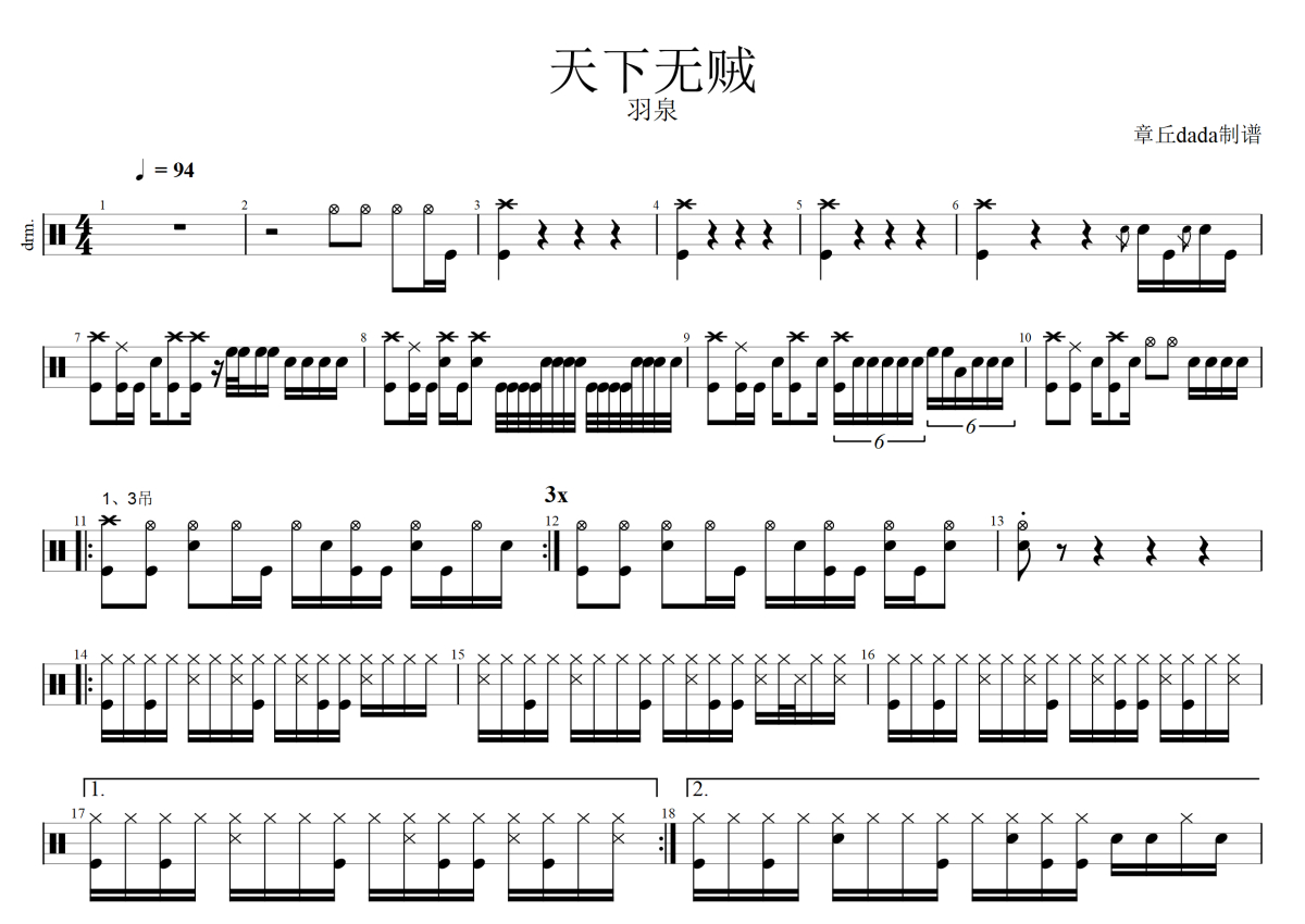 《天下无贼》是羽泉演唱的一首歌曲,拍号为4/4拍,这份架子鼓谱共有两张高清图谱,图谱由 @微信用户 编配上传,图谱使用五线谱编配,使用这份天下无贼架子鼓谱,你将能够轻松地敲打出这首羽泉的天下无贼,快来尝试吧。
