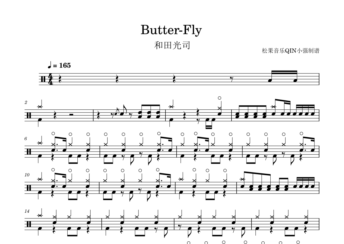 《Butter-Fly》是和田光司演唱的一首歌曲,拍号为4/4拍,这份架子鼓谱共有五张高清图谱,图谱由 @松果音乐QIN小强 编配上传,图谱使用五线谱编配,使用这份Butter-Fly架子鼓谱,你将能够轻松地敲打出这首和田光司的Butter-Fly,快来尝试吧。《Butter-Fly》是日本电视动画片《数码宝贝大冒险》的片头曲以及关联动画电影《数码宝贝大冒险》《数码宝贝大冒险:我们的战争游戏!》的主题曲,由千绵伟功创作,和田光司演唱,渡部达也编曲,于1999年4月23日通过同名单曲碟发行。