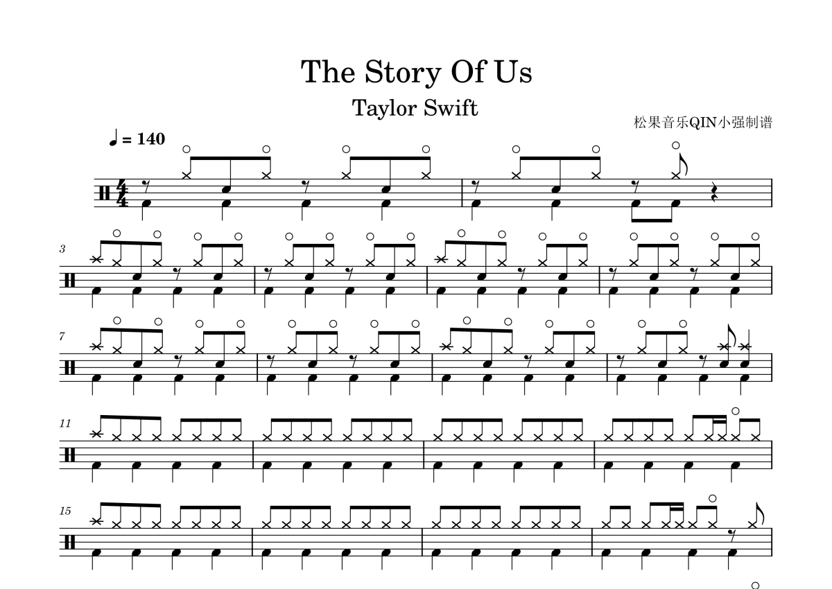 《The Story of Us》是泰勒·斯威夫特(Taylor Swift)演唱的一首歌曲,拍号为4/4拍,这份架子鼓谱共有四张高清图谱,图谱由 @松果音乐QIN小强 编配上传,图谱使用五线谱编配,使用这份The Story of Us架子鼓谱,你将能够轻松地敲打出这首泰勒·斯威夫特(Taylor Swift)的The Story of Us,快来尝试吧。《The Story of Us》是美国女歌手演唱的一首流行摇滚歌曲,歌词和曲谱由泰勒·斯威夫特和内森·查普曼共同创作,收录在泰勒·斯威夫特2010年发行的第三张录音室专辑《Speak Now》。