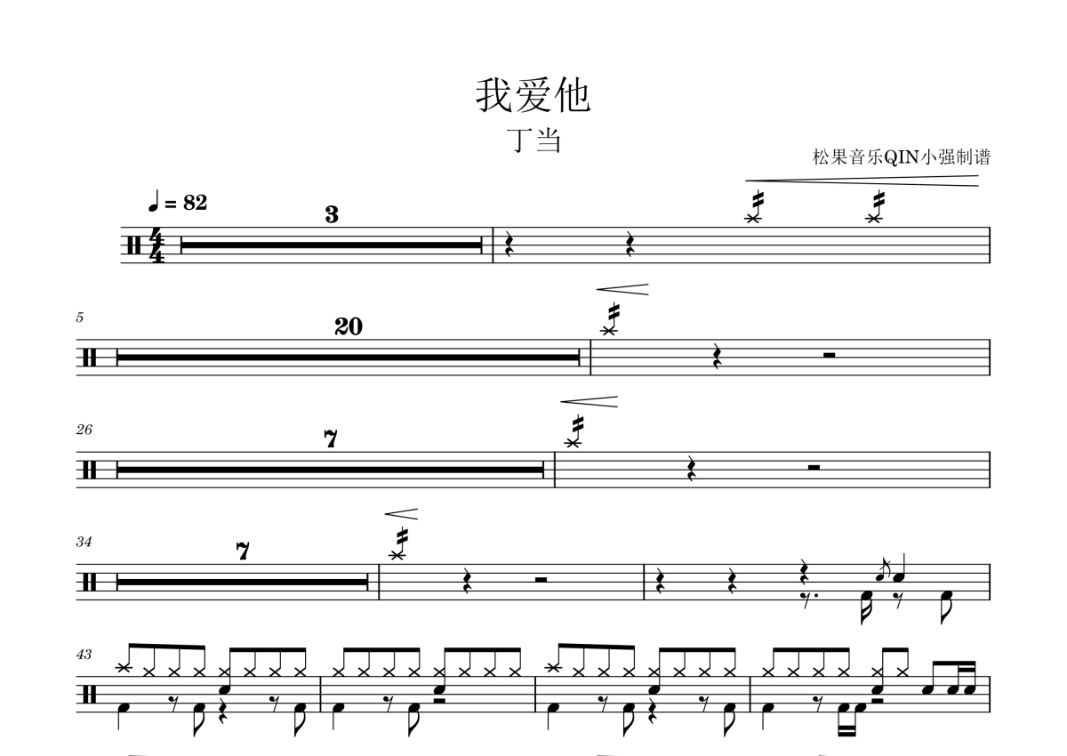《我爱他》是丁当演唱的一首歌曲,拍号为4/4拍,这份架子鼓谱共有两张高清图谱,图谱由 @松果音乐QIN小强 编配上传,图谱使用五线谱编配,使用这份我爱他架子鼓谱,你将能够轻松地敲打出这首丁当的我爱他,快来尝试吧。《我爱他》是丁当演唱的流行歌曲,由黄婷作词,陈威全作曲,Wave G编曲,收录于丁当的第三张个人专辑《夜猫》中,于2009年9月29日随专辑通过相信音乐发行。同时,该曲亦是台湾电视剧《下一站,幸福》的主题曲。