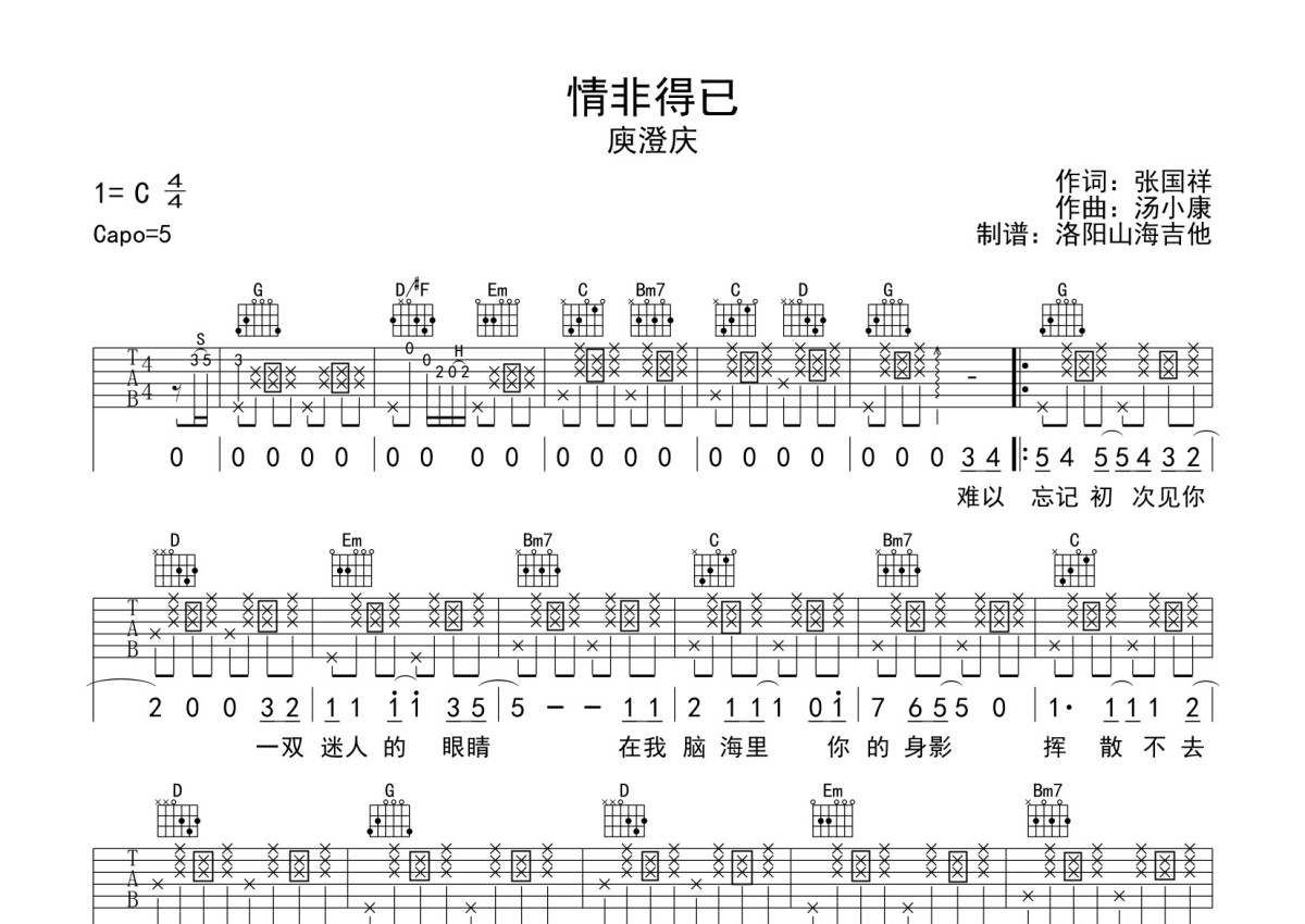 《情非得已》是庾澄庆演唱的一首歌曲,新手弹唱版,本吉他谱采用的是G调指法编配,这份吉他谱共有两张高清图谱,图谱由 @何奔洋 编配上传,图谱使用六线谱编配,包含吉他和弦指法、简谱以及歌词部分,曲谱配备了相关的音频提供试听,使用这份情非得已吉他谱,可以让你更加方便地掌握这首歌曲的弹唱技巧,快来尝试吧。