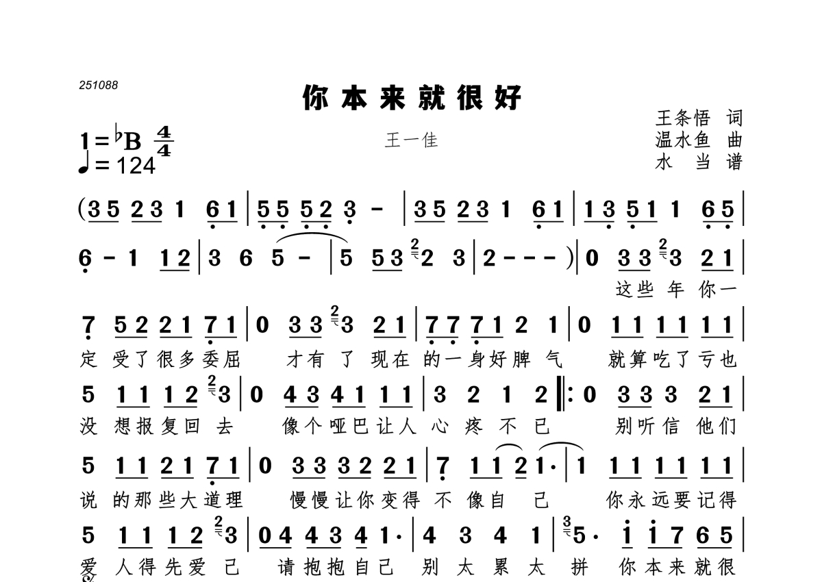 《你本来就很好》是王一佳演唱的一首歌曲,拍号为4/4拍,歌曲速度为每分钟124拍,这份简谱共有一张高清图谱,图谱由 @水当 编配上传。