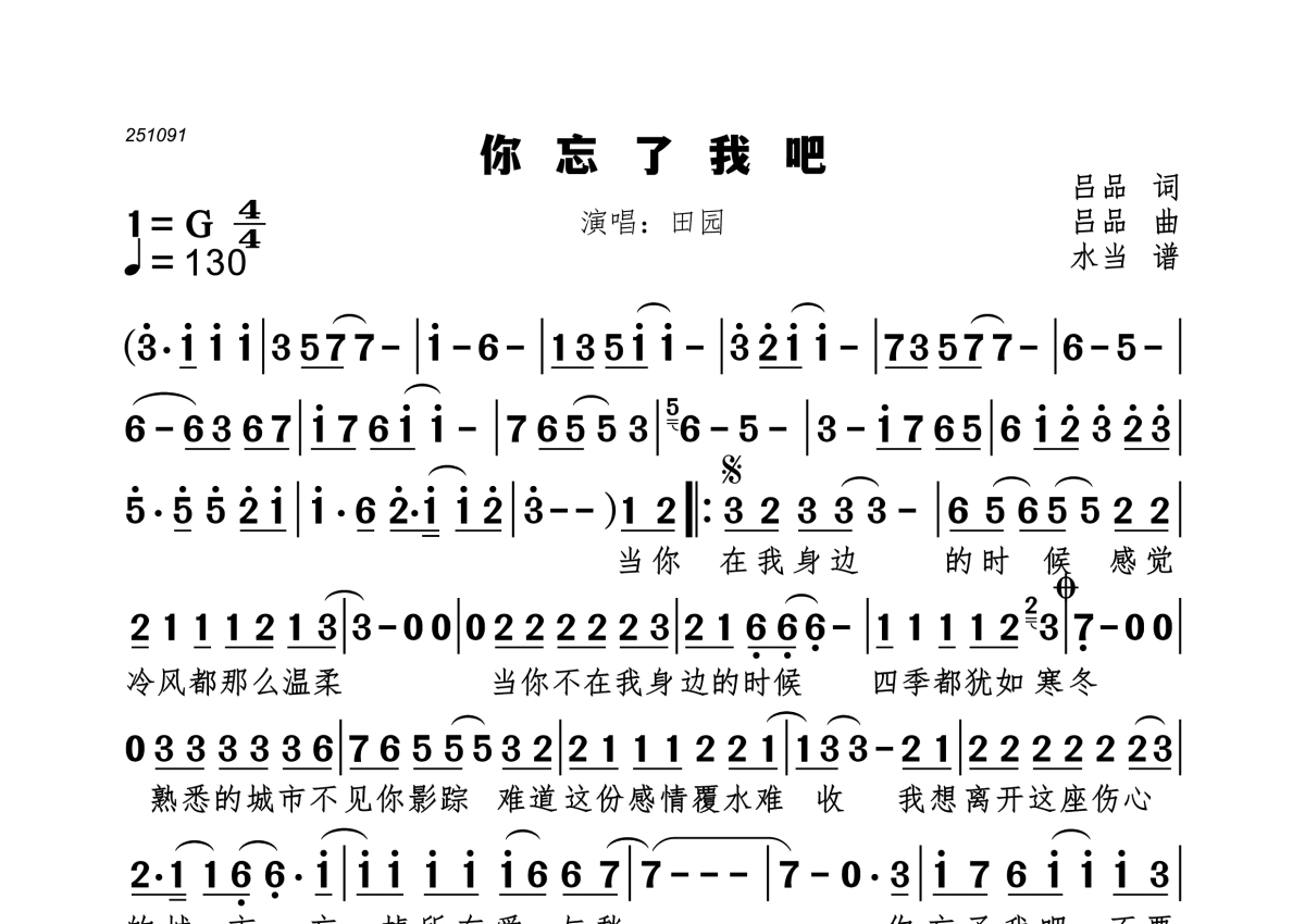 《你忘了我吧》是田园演唱的一首歌曲,拍号为4/4拍,歌曲速度为每分钟130拍,这份简谱共有一张高清图谱,图谱由 @水当 编配上传。