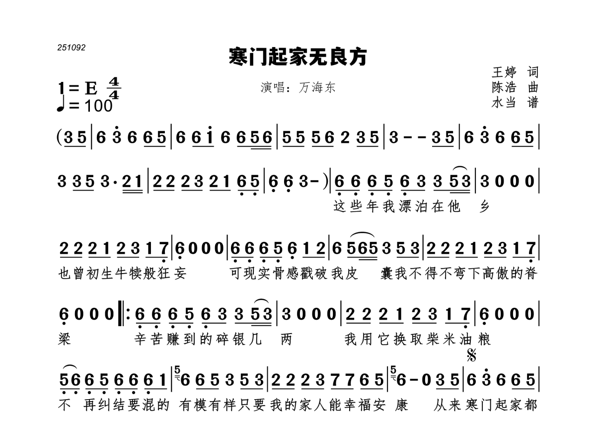 《寒门起家无良方》是方海东演唱的一首歌曲,拍号为4/4拍,歌曲速度为每分钟100拍,这份简谱共有一张高清图谱,图谱由 @水当 编配上传。