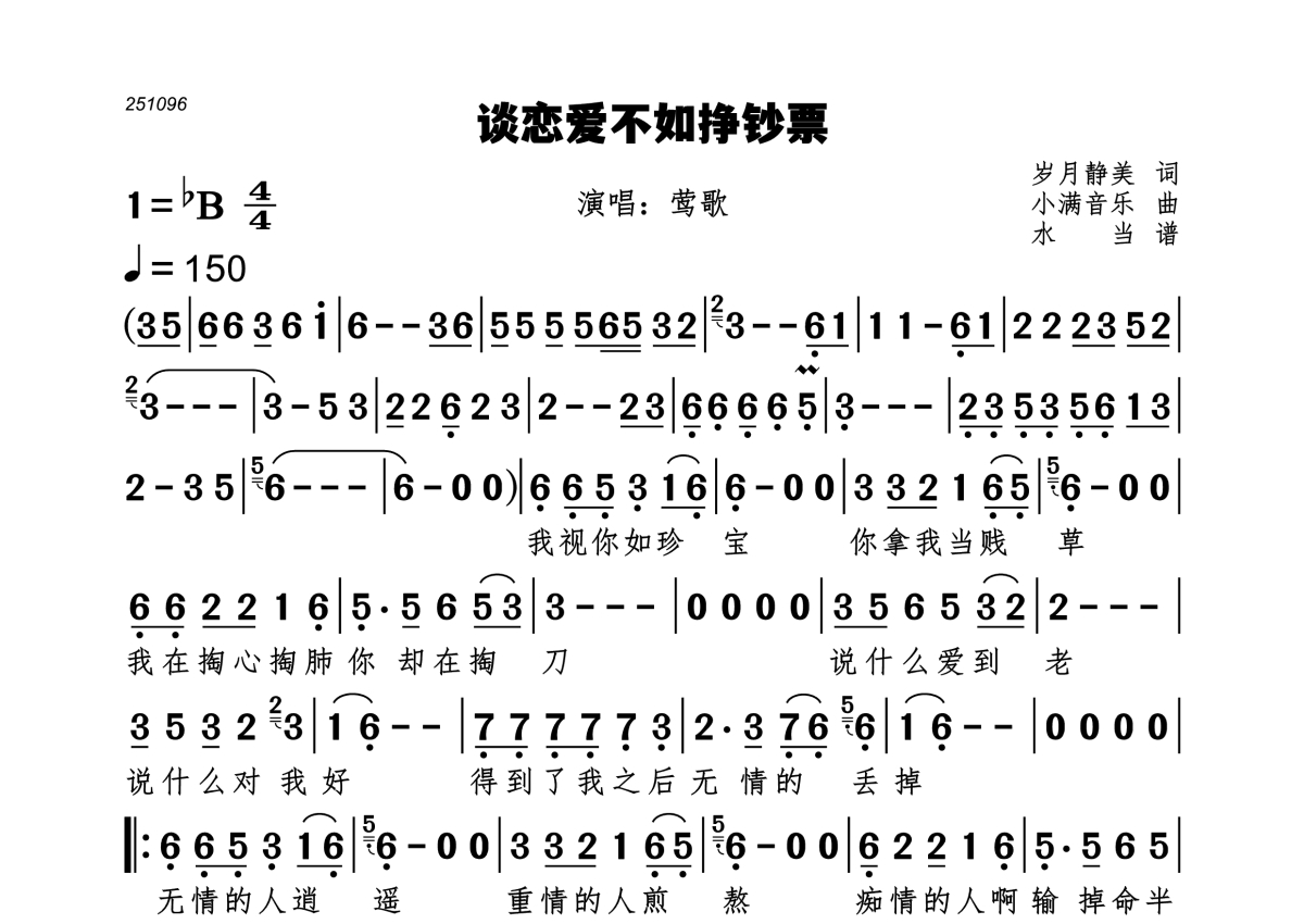《谈恋爱不如挣钞票》是莺歌演唱的一首歌曲,拍号为4/4拍,歌曲速度为每分钟150拍,这份简谱共有一张高清图谱,图谱由 @水当 编配上传。