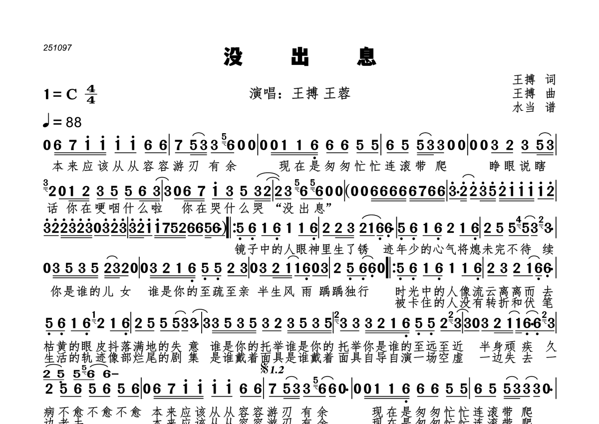 《没出息》是王搏 王蓉演唱的一首歌曲,这份简谱共有一张高清图谱,图谱由 @水当 编配上传。