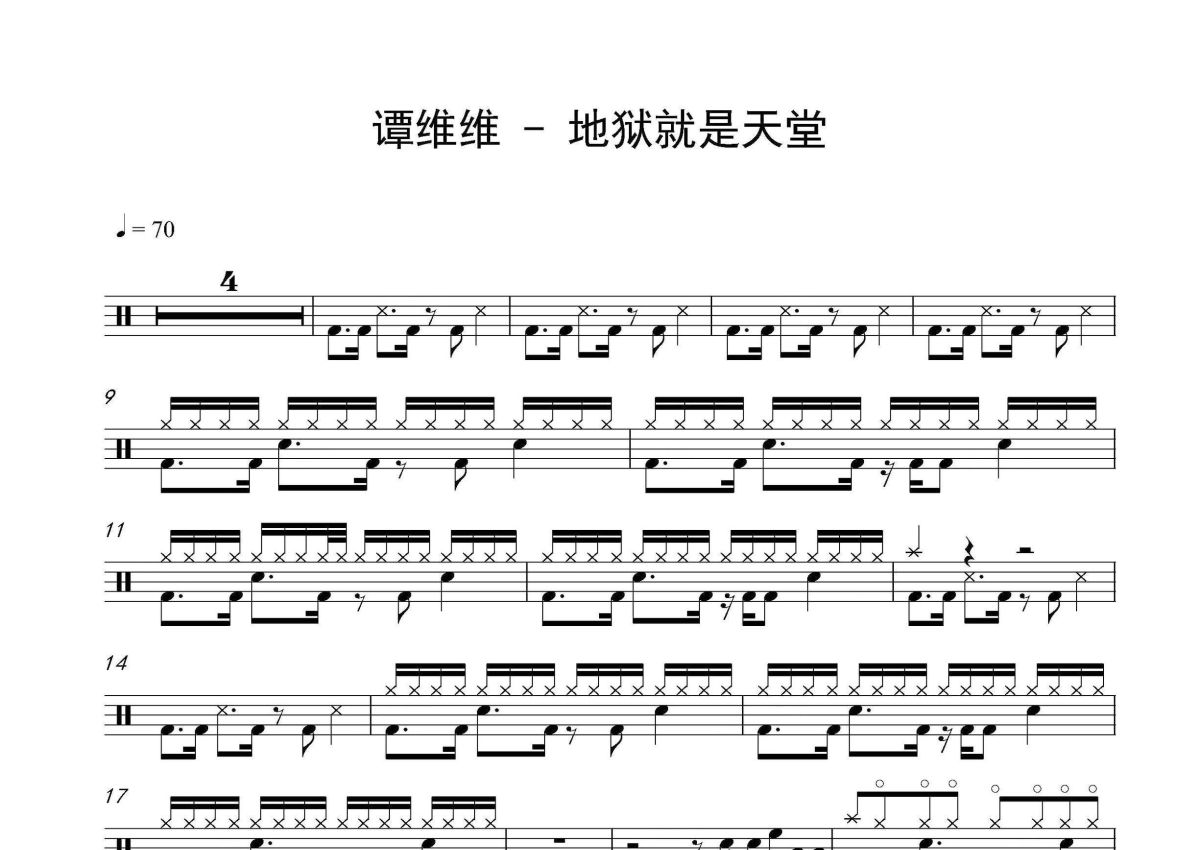 《地狱就是天堂》是谭维维演唱的一首歌曲,拍号为4/4拍,歌曲速度为每分钟70拍,这份架子鼓谱共有两张高清图谱,图谱由 @音符喷血者 编配上传,图谱使用五线谱编配,使用这份地狱就是天堂架子鼓谱,你将能够轻松地敲打出这首谭维维的地狱就是天堂,快来尝试吧。