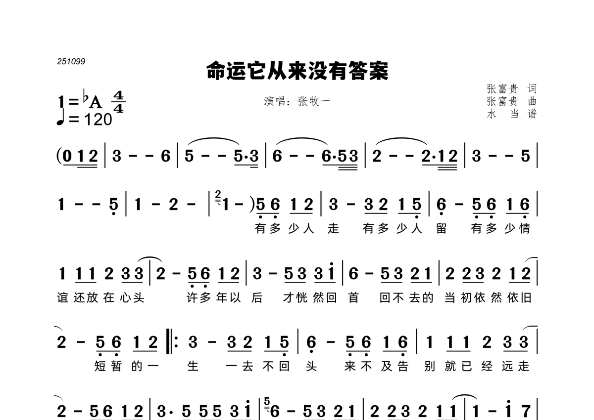 《命运它从来没有答案》是张牧一演唱的一首歌曲,拍号为4/4拍,歌曲速度为每分钟120拍,这份简谱共有一张高清图谱,图谱由 @水当 编配上传。