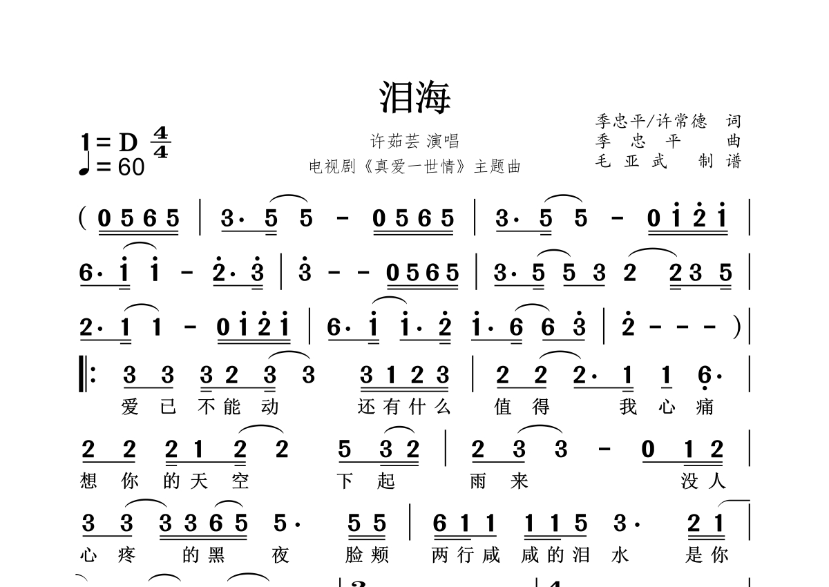 《泪海》是许茹芸演唱的一首歌曲,这份简谱共有两张高清图谱,图谱由 @秋天的童话 编配上传。