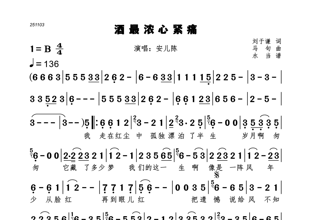 《酒最浓心紧痛》是安儿陈演唱的一首歌曲,拍号为4/4拍,歌曲速度为每分钟136拍,这份简谱共有一张高清图谱,图谱由 @水当 编配上传。