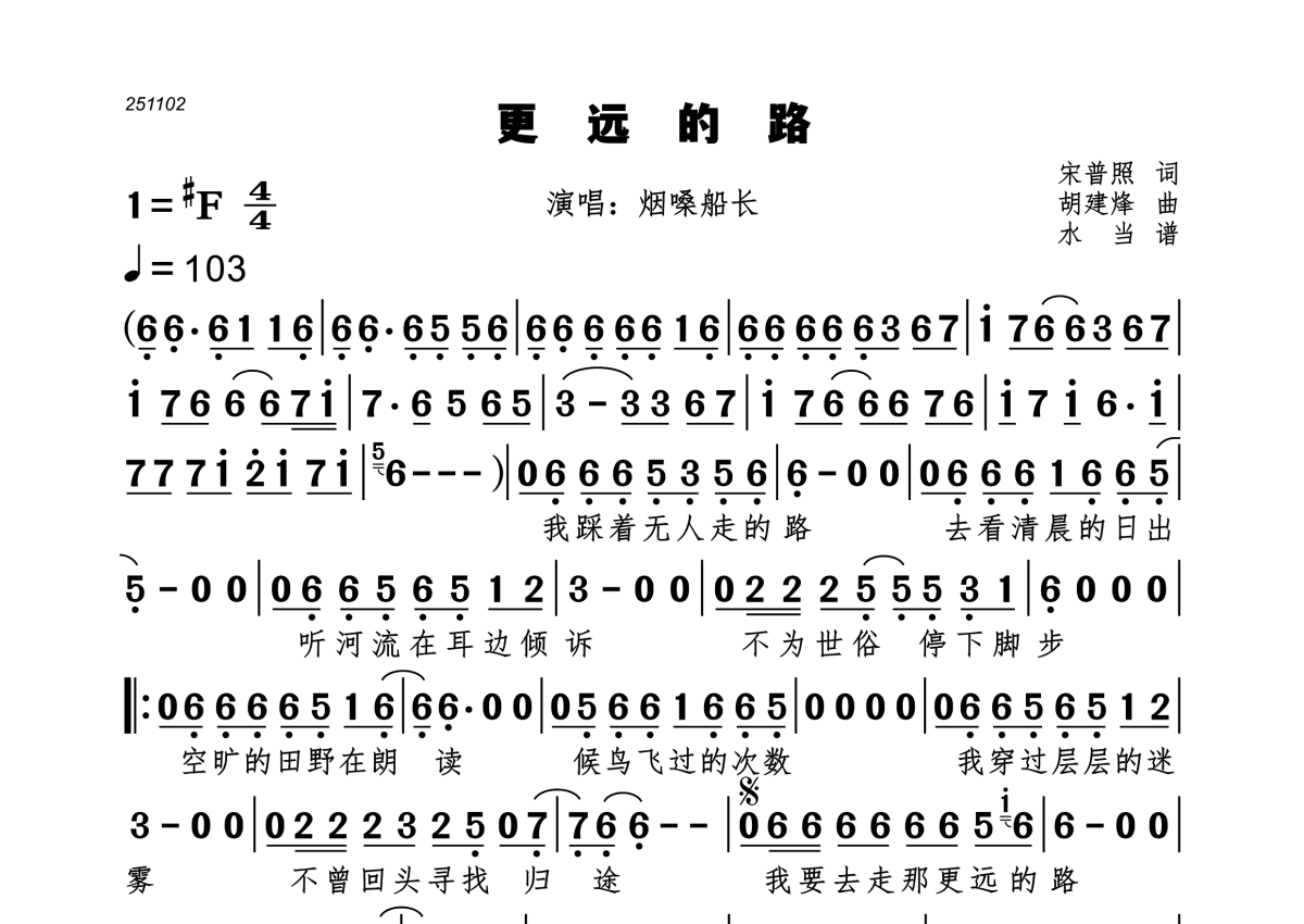 《更远的路》是烟嗓船长演唱的一首歌曲,这份简谱共有一张高清图谱,图谱由 @水当 编配上传。
