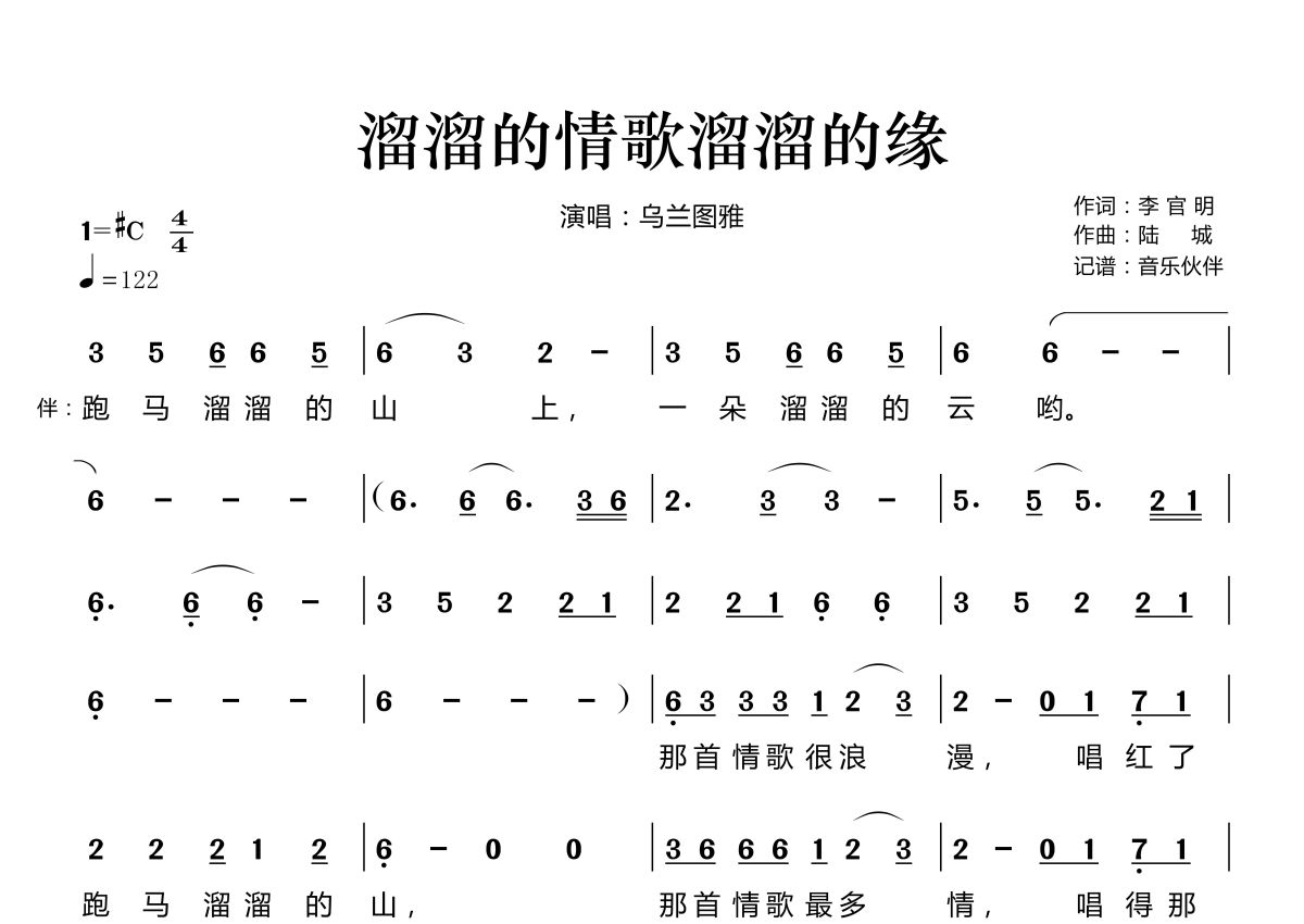 《溜溜的情歌溜溜的缘》是乌兰图雅演唱的一首歌曲,拍号为4/4拍,歌曲速度为每分钟122拍,这份简谱共有两张高清图谱,图谱由 @音乐伙伴 编配上传。