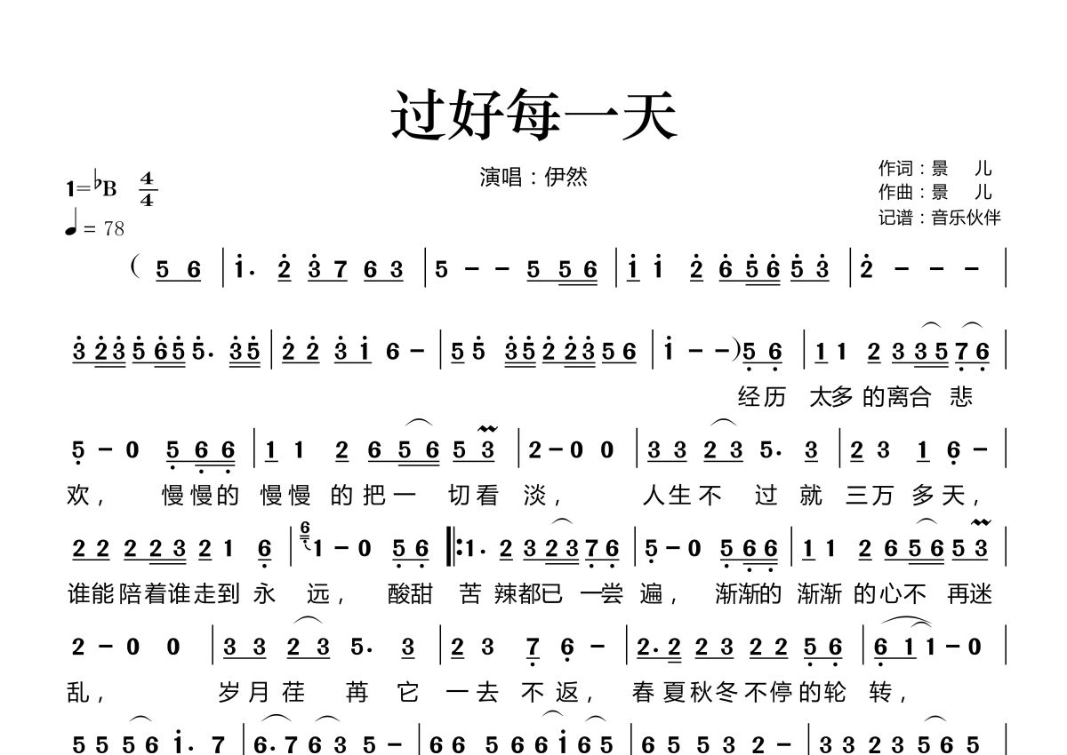 《过好每一天》是景儿演唱的一首歌曲,拍号为4/4拍,歌曲速度为每分钟78拍,这份简谱共有一张高清图谱,图谱由 @音乐伙伴 编配上传。