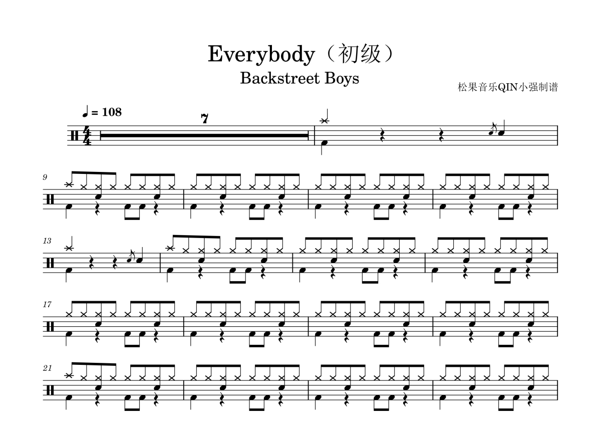 《Everybody(初级)》是初级演唱的一首歌曲,拍号为4/4拍,这份架子鼓谱共有两张高清图谱,图谱由 @松果音乐QIN小强 编配上传,图谱使用五线谱编配,使用这份Everybody(初级)架子鼓谱,你将能够轻松地敲打出这首初级的Everybody(初级),快来尝试吧。《Everybody》是美国男子组合后街男孩演唱的摇滚风格歌曲,由Denniz Pop与Max Martin创作,作为1997年8月1日发行的专辑《Backstreet’s Back》主打单曲,最初在日本发行后因美国电台热播成为专辑第三推广曲目。
