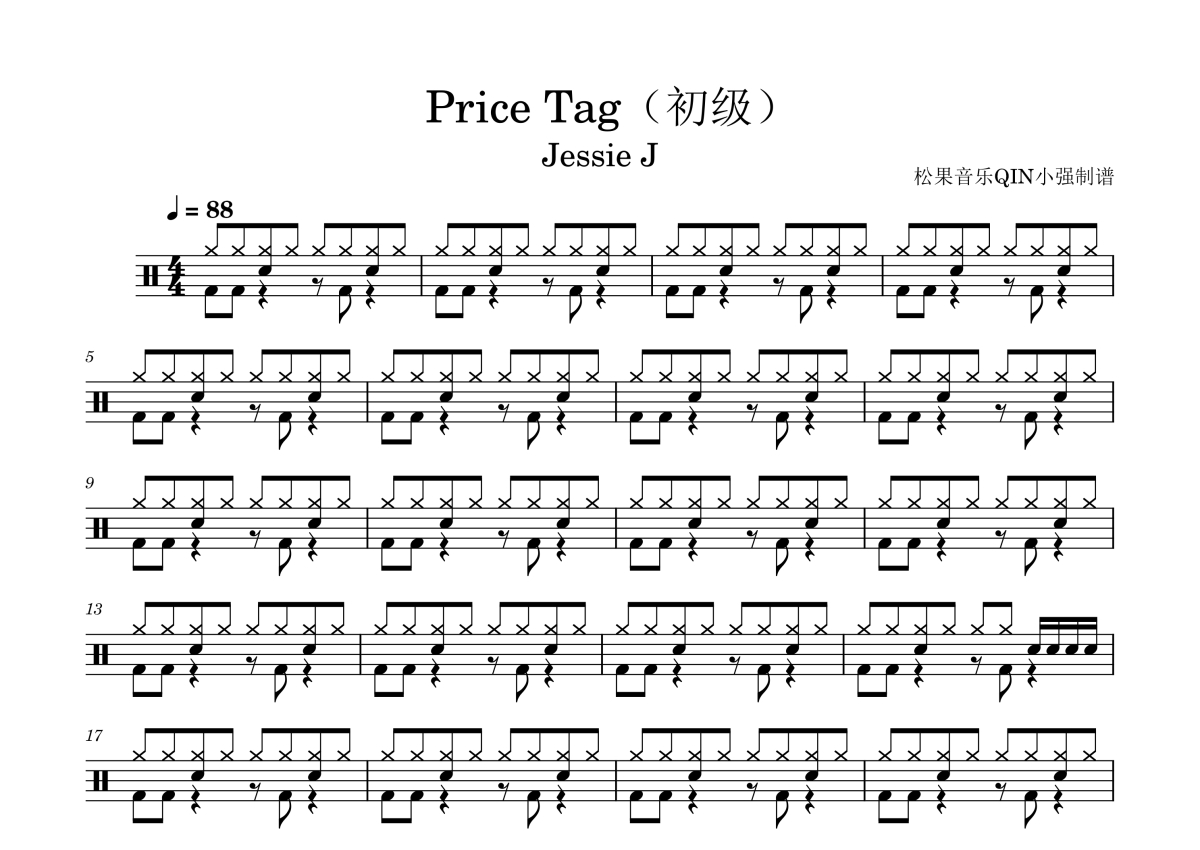 《Price Tag》是Jessie J演唱的一首歌曲,拍号为4/4拍,这份架子鼓谱共有两张高清图谱,图谱由 @松果音乐QIN小强 编配上传,图谱使用五线谱编配,使用这份Price Tag架子鼓谱,你将能够轻松地敲打出这首Jessie J的Price Tag,快来尝试吧。《价格标签》是杰西·J和B.o.B演唱的一首歌曲,由Jessie J、卢克博士、克劳德·凯利、B.o.B和小詹姆斯·达尔文作词、作曲,作为单曲于2011年1月28日通过环球唱片发行,后收录至Jessie J的个人首张录音室专辑《你是谁》中。