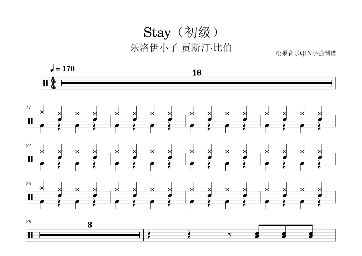 《STAY(初级)》是初级演唱的一首歌曲,拍号为4/4拍,这份架子鼓谱共有两张高清图谱,图谱由 @松果音乐QIN小强 编配上传,图谱使用五线谱编配,使用这份STAY(初级)架子鼓谱,你将能够轻松地敲打出这首初级的STAY(初级),快来尝试吧。《STAY》是由乐洛伊小子与贾斯汀·比伯演唱的一首歌曲,由贾斯汀·比伯、乐洛伊小子、奥梅尔·费迪、布莱克·斯莱特金、查理·普斯和马格努斯·霍伊伯格作词、作曲。该曲创作缘起于2020年查理·普斯即兴弹奏的旋律片段,乐洛伊小子随后邀请贾斯汀·比伯参与录唱。