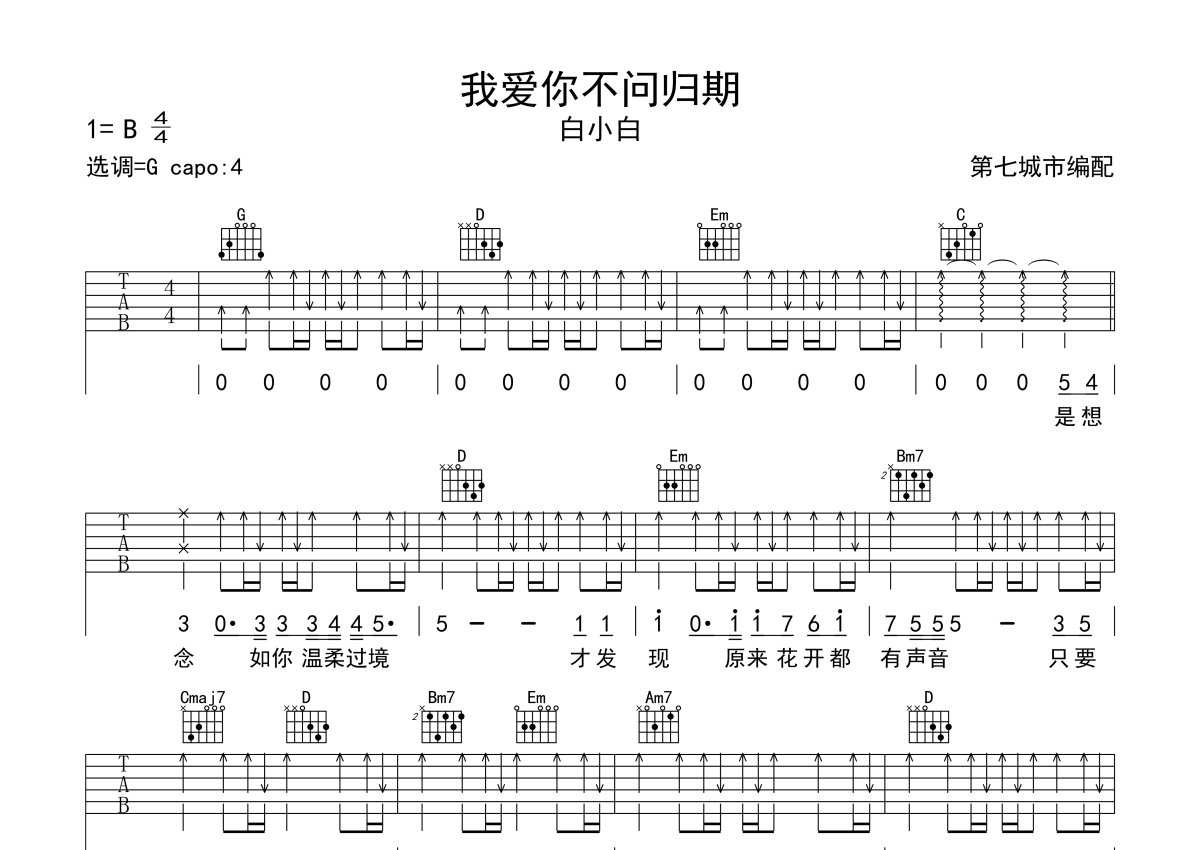 白小白《我爱你不问归期》吉他谱 - G调弹唱六线谱
