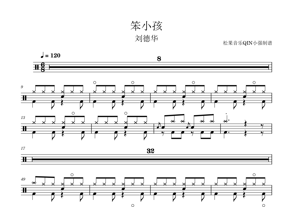 《笨小孩》是刘德华演唱的一首歌曲,拍号为6/8拍,这份架子鼓谱共有三张高清图谱,图谱由 @松果音乐QIN小强 编配上传,图谱使用五线谱编配,使用这份笨小孩架子鼓谱,你将能够轻松地敲打出这首刘德华的笨小孩,快来尝试吧。《笨小孩》是由高枫作曲,刘德华作词,江建民编曲,刘德华演唱的歌曲。该曲分刘德华个人独唱版本和刘德华、柯受良、吴宗宪三人合唱的版本。