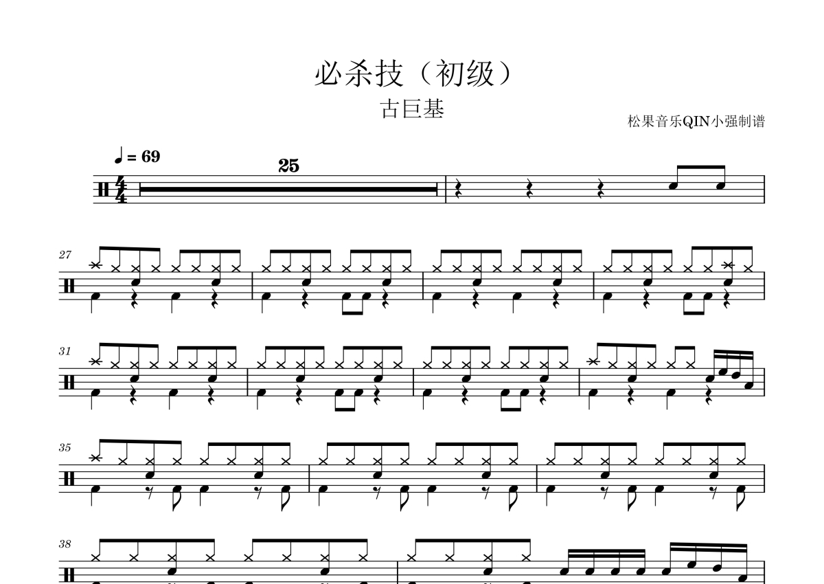《必杀技(初级)》是初级演唱的一首歌曲,拍号为4/4拍,这份架子鼓谱共有一张高清图谱,图谱由 @松果音乐QIN小强 编配上传,图谱使用五线谱编配,使用这份必杀技(初级)架子鼓谱,你将能够轻松地敲打出这首初级的必杀技(初级),快来尝试吧。《必杀技》是古巨基演唱的流行歌曲,由林夕作词,林健华作曲,Robert Lay编曲,收录于古巨基的个人第20张音乐专辑《游戏基》中,于2003年12月5日随专辑通过华纳音乐发行。
