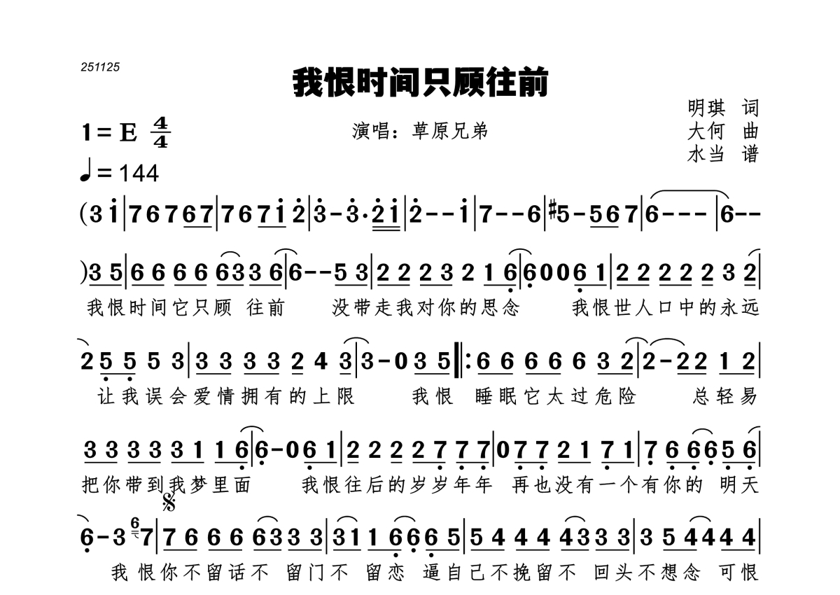 《我恨时间只顾往前》是草原兄弟演唱的一首歌曲,拍号为4/4拍,歌曲速度为每分钟144拍,这份简谱共有一张高清图谱,图谱由 @水当 编配上传。