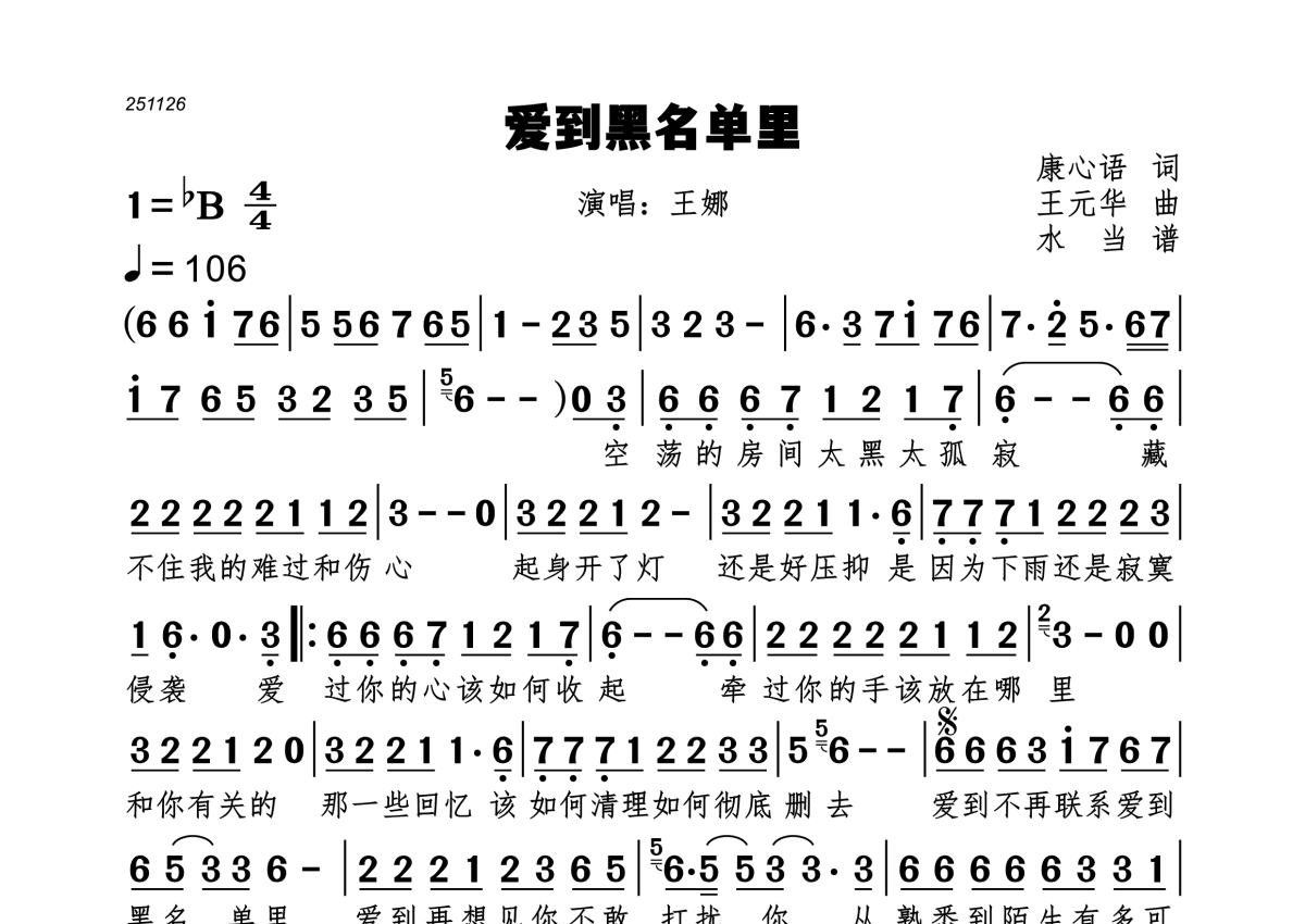 《爱到黑名单里》是王娜演唱的一首歌曲,拍号为4/4拍,歌曲速度为每分钟106拍,这份简谱共有一张高清图谱,图谱由 @水当 编配上传。