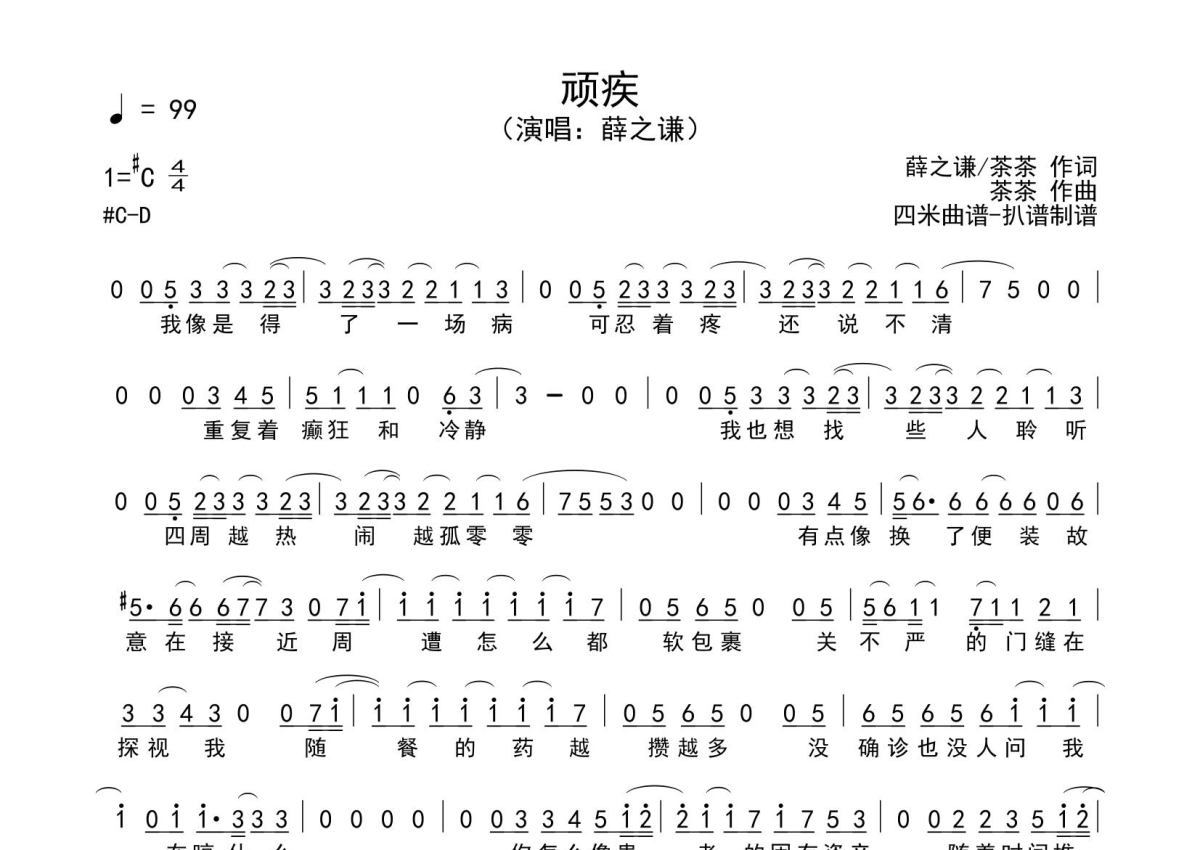 《顽疾》是薛之谦演唱的一首歌曲,拍号为4/4拍,这份简谱共有两张高清图谱,图谱由 @SRV7758521 编配上传。