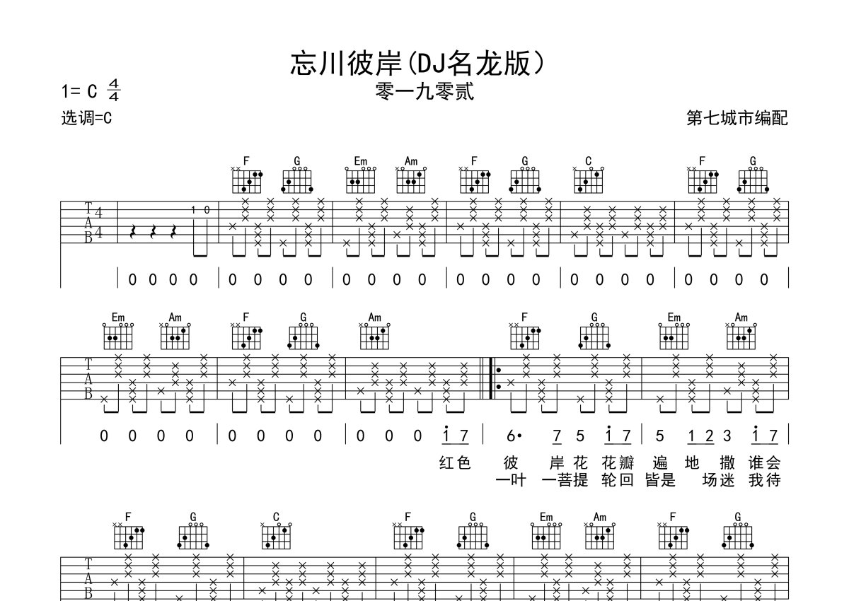 《忘川彼岸》是零一九零贰演唱的一首歌曲,本吉他谱采用的是C调指法编配,这份吉他谱共有两张高清图谱,图谱由 @第七城市 编配上传,图谱使用六线谱编配,包含吉他和弦指法、简谱以及歌词部分,曲谱配备了相关的音频提供试听,使用这份忘川彼岸吉他谱,可以让你更加方便地掌握这首歌曲的弹唱技巧,快来尝试吧。零一九零贰《忘川彼岸》吉他谱,DJ名龙版。忘川彼岸吉他弹唱谱,我跨过忘川,也走过彼岸,最近这首歌在抖音迅速蹿红,原版主要是以缓慢抒情为主,网上很多翻唱,DJ版魔性入耳,重新演绎后更加有动感和活力。