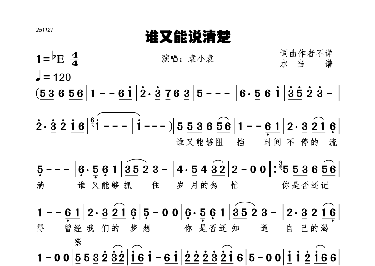 《谁又能说清楚》是袁小袁演唱的一首歌曲,拍号为4/4拍,歌曲速度为每分钟120拍,这份简谱共有一张高清图谱,图谱由 @水当 编配上传。