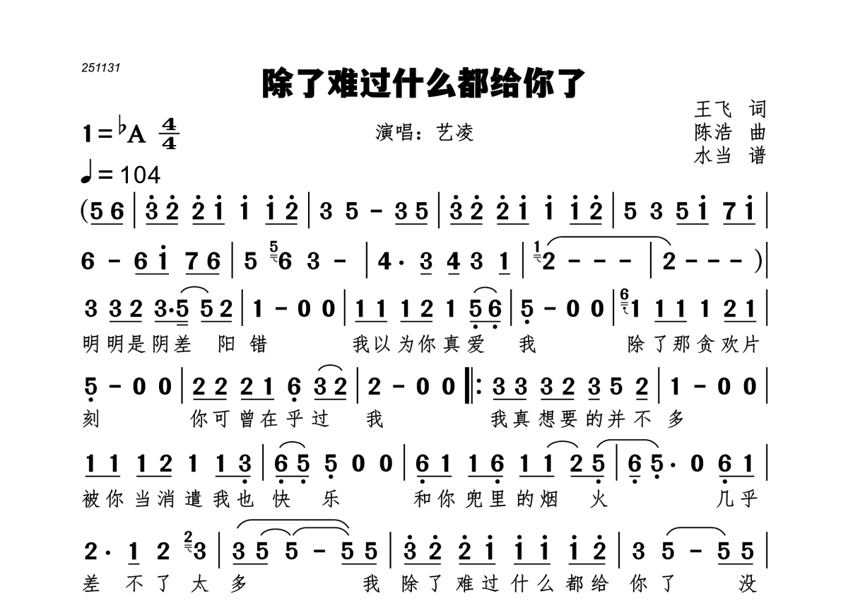 《除了难过什么都给你了》是艺凌演唱的一首歌曲,拍号为4/4拍,歌曲速度为每分钟104拍,这份简谱共有一张高清图谱,图谱由 @水当 编配上传。