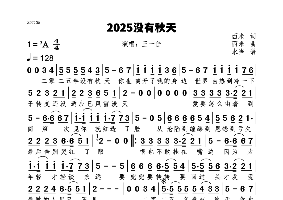 《2025没有秋天》是王一佳演唱的一首歌曲,拍号为4/4拍,歌曲速度为每分钟128拍,这份简谱共有一张高清图谱,图谱由 @水当 编配上传。