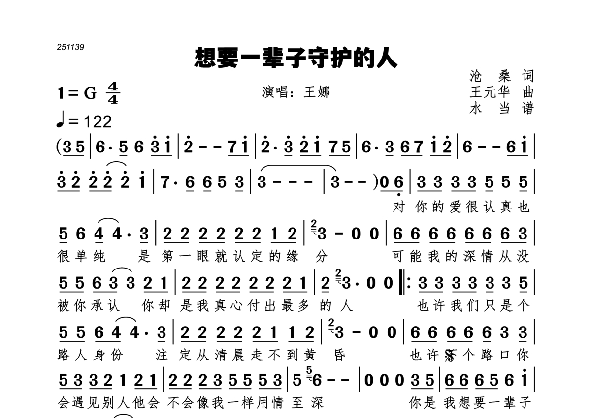 《想要一辈子守护的人》是王娜演唱的一首歌曲,拍号为4/4拍,歌曲速度为每分钟122拍,这份简谱共有一张高清图谱,图谱由 @水当 编配上传。