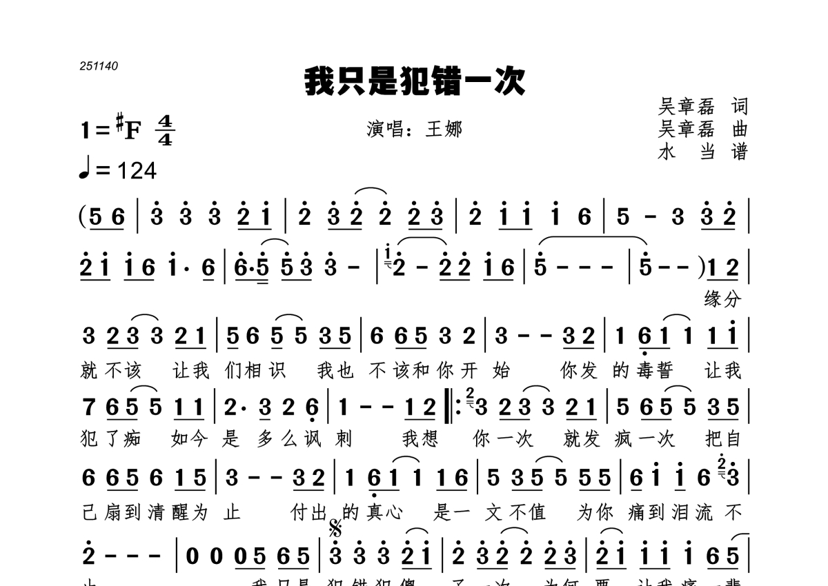 《我只是犯错一次》是王娜演唱的一首歌曲,歌曲速度为每分钟124拍,这份简谱共有一张高清图谱,图谱由 @水当 编配上传。