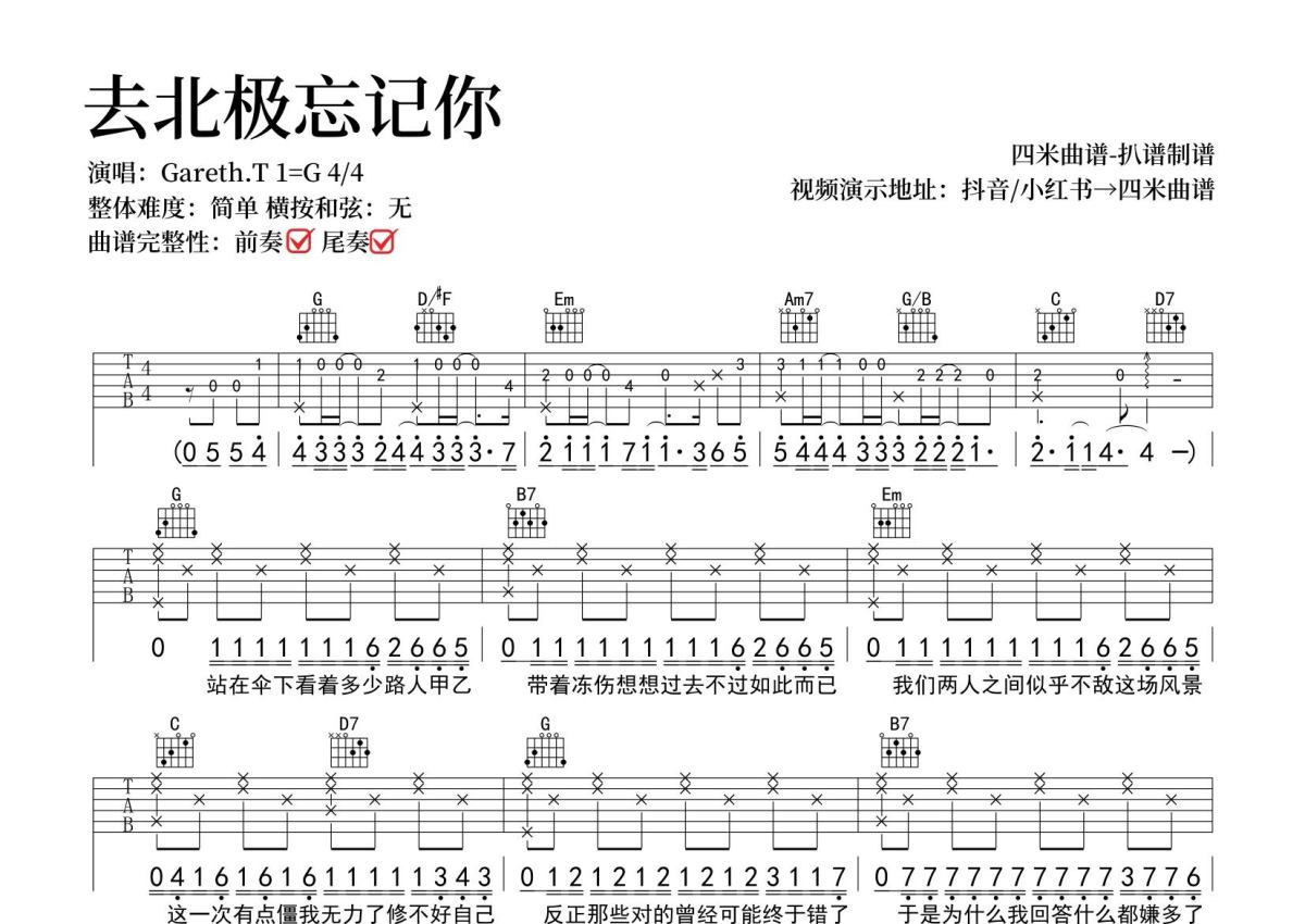去北极忘记你吉他谱 - Gareth.T演唱 - G调弹唱六线谱