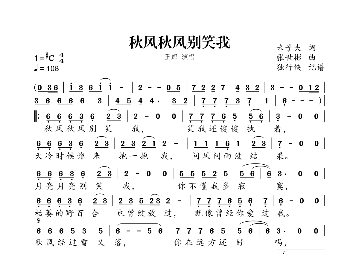 《秋风秋风别笑我》是王娜演唱的一首歌曲,拍号为4/4拍,歌曲速度为每分钟108拍,这份简谱共有一张高清图谱,图谱由 @独行侠 编配上传。