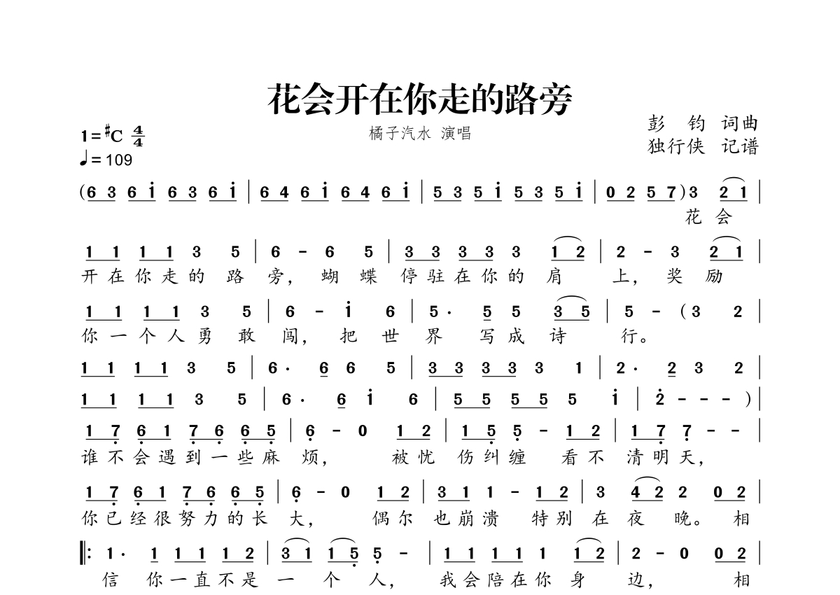 《花会开在你走的路旁》是橘子汽水演唱的一首歌曲,拍号为4/4拍,歌曲速度为每分钟109拍,这份简谱共有一张高清图谱,图谱由 @独行侠 编配上传。