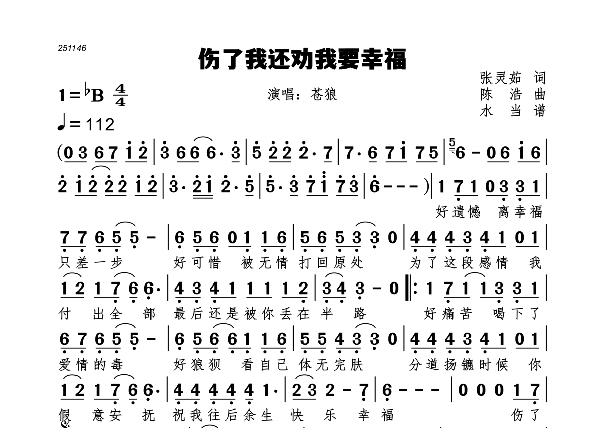 《伤了我还劝我要幸福》是苍狼演唱的一首歌曲,拍号为4/4拍,歌曲速度为每分钟112拍,这份简谱共有一张高清图谱,图谱由 @水当 编配上传。