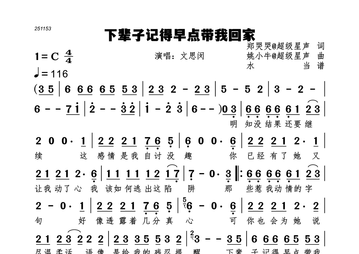 下辈子记得早点带我回家简谱 - 文思闵演唱