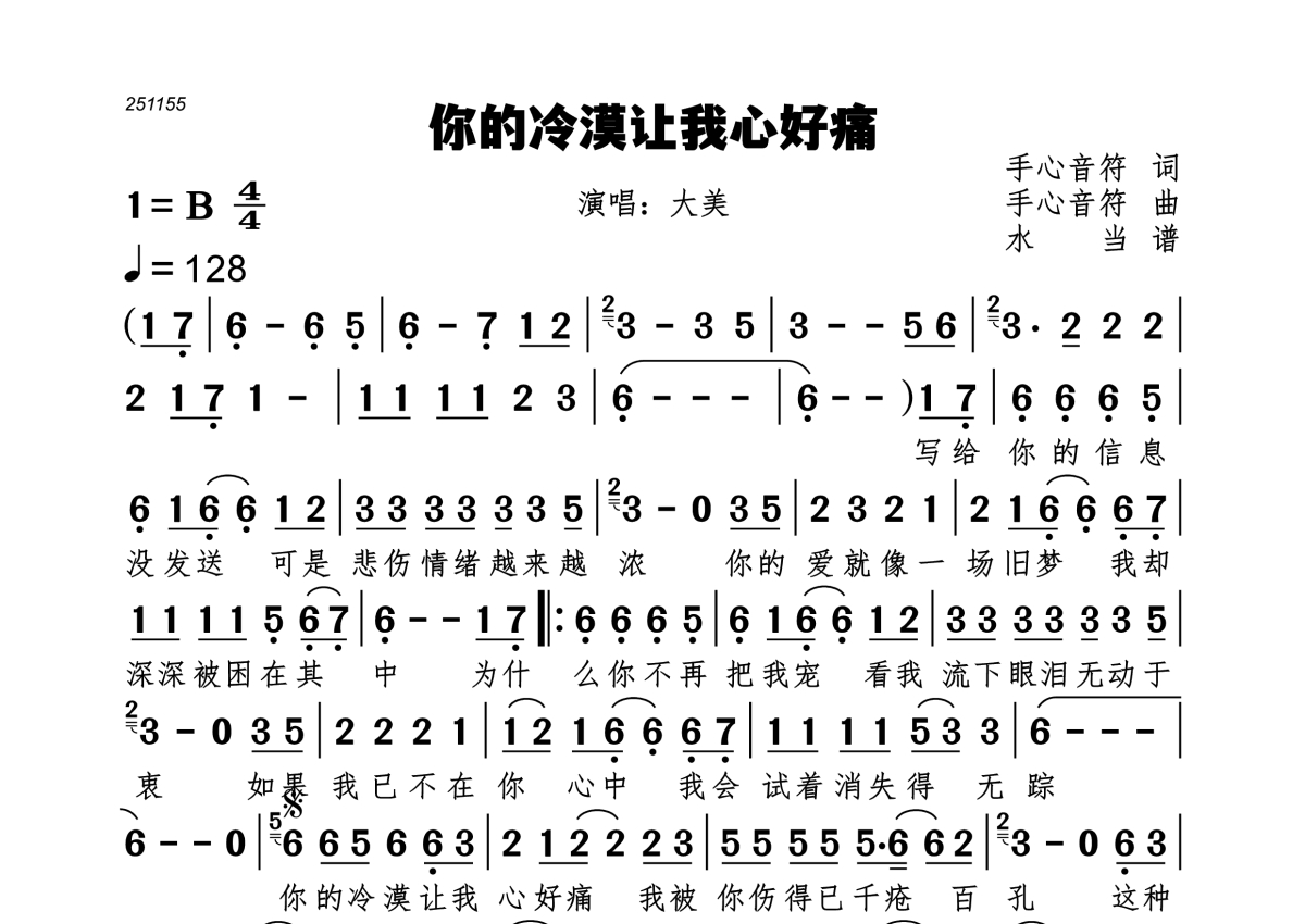 《你的冷漠让我心好痛》是大美演唱的一首歌曲,拍号为4/4拍,歌曲速度为每分钟128拍,这份简谱共有一张高清图谱,图谱由 @水当 编配上传。