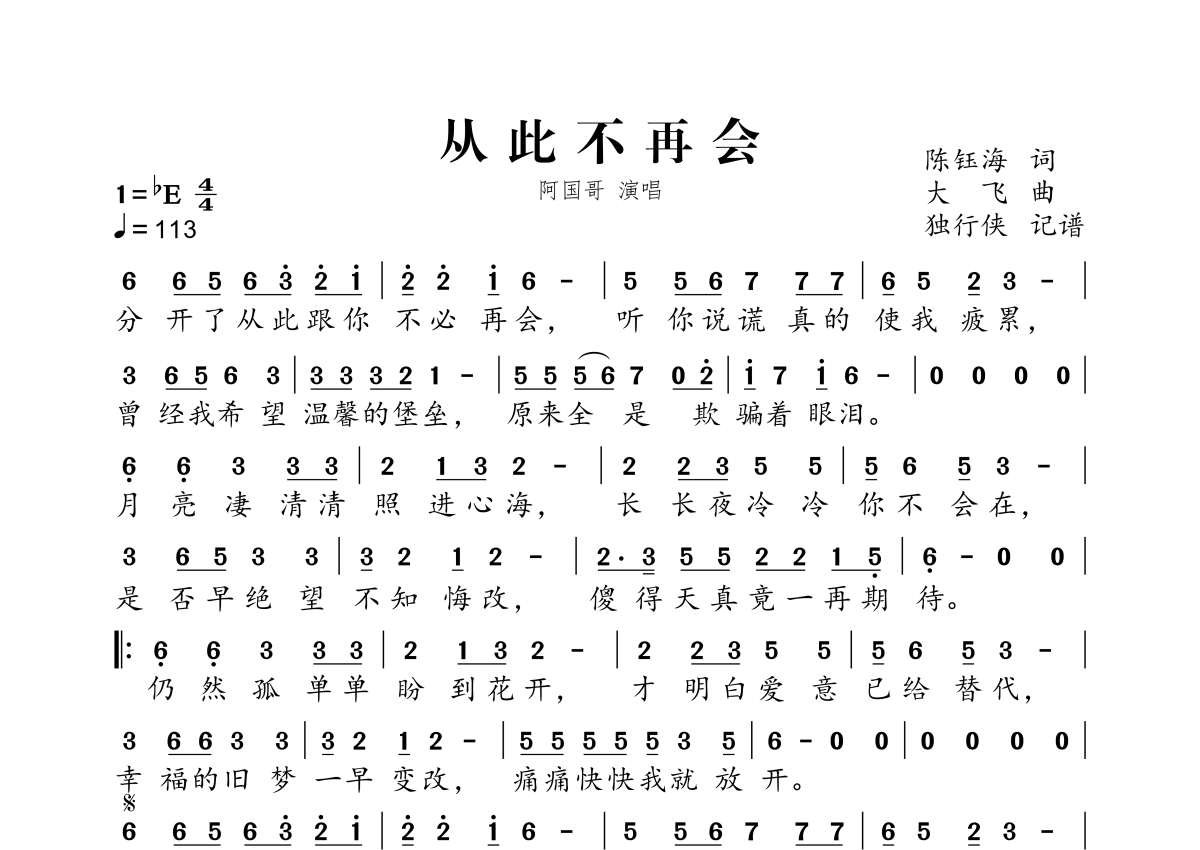 《从此不再会》是阿国哥演唱的一首歌曲,拍号为4/4拍,歌曲速度为每分钟113拍,这份简谱共有一张高清图谱,图谱由 @独行侠 编配上传。