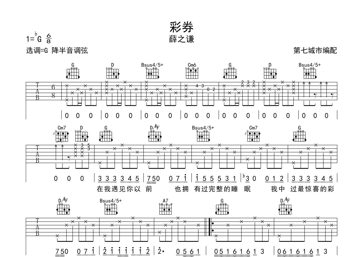 《彩券》是薛之谦演唱的一首歌曲,本吉他谱采用的是G调指法编配,这份吉他谱共有两张高清图谱,图谱由 @第七城市 编配上传,图谱使用六线谱编配,包含吉他和弦指法、简谱以及歌词部分,曲谱配备了相关的音频提供试听,使用这份彩券吉他谱,可以让你更加方便地掌握这首歌曲的弹唱技巧,快来尝试吧。薛之谦暖心新歌《彩券》,整首歌曲的曲调都是温和的,歌词也非常温暖,仿佛在用另一种方式表达着简单的生活,但是这样的生活里充满了小惊喜,不是欢呼雀跃,而是暗自欢喜。遇见你是我中过最惊喜的彩券,那是千万分之一的概率,是可遇不可求的惊喜,演奏建议降半音调弦。