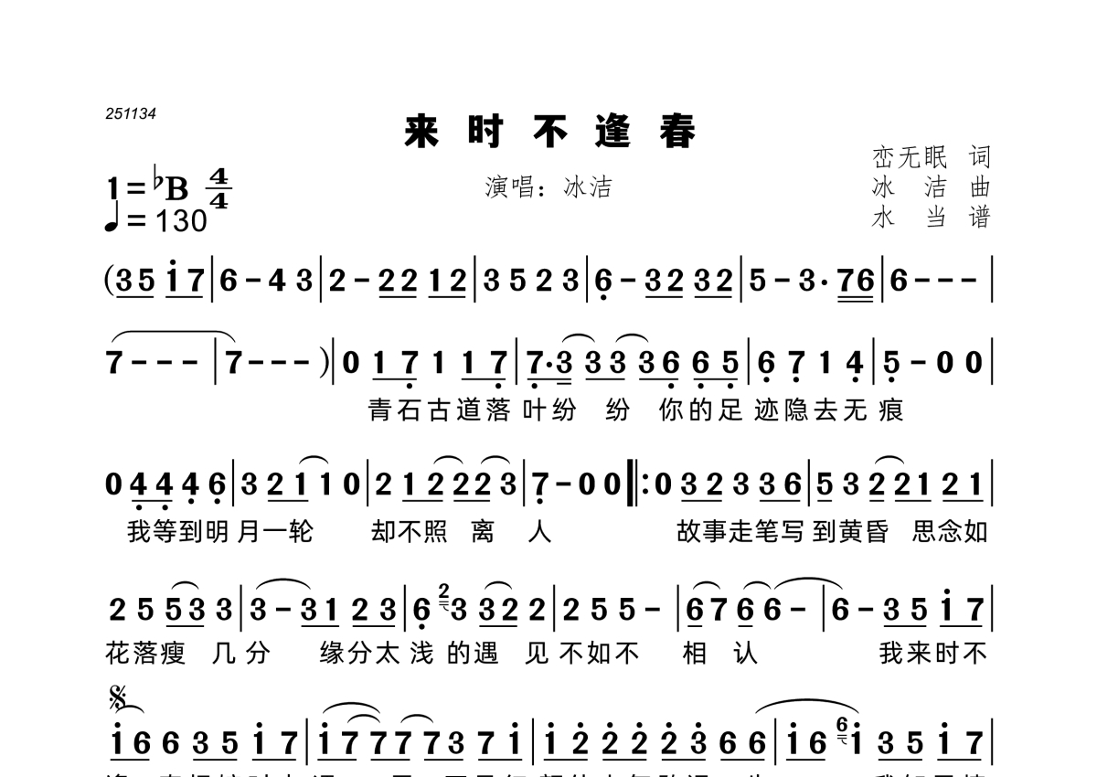 《来时不逢春》是冰洁演唱的一首歌曲,拍号为4/4拍,歌曲速度为每分钟130拍,这份简谱共有一张高清图谱,图谱由 @水当 编配上传。