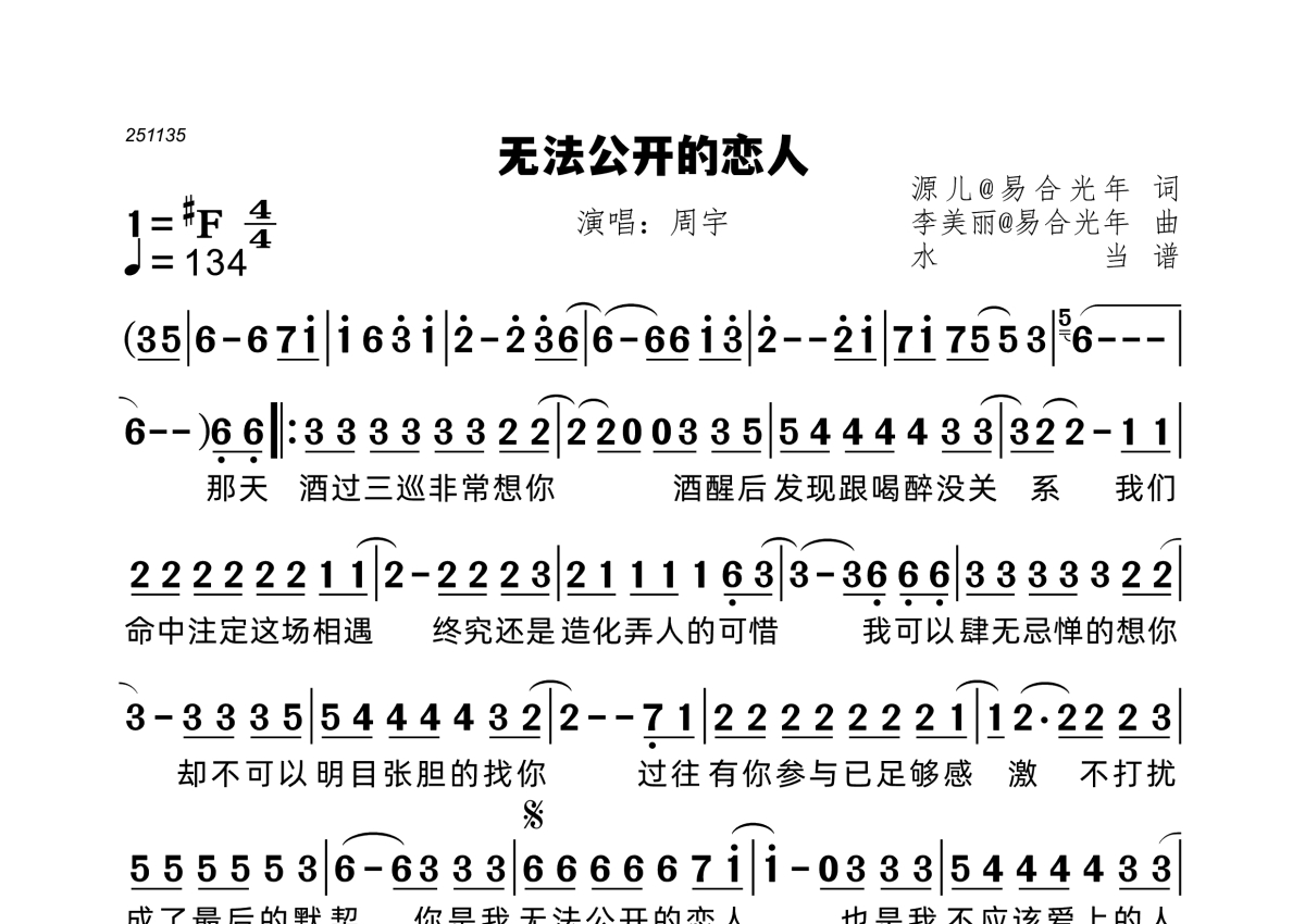 《无法公开的恋人》是周宇演唱的一首歌曲,拍号为4/4拍,歌曲速度为每分钟134拍,这份简谱共有一张高清图谱,图谱由 @水当 编配上传。