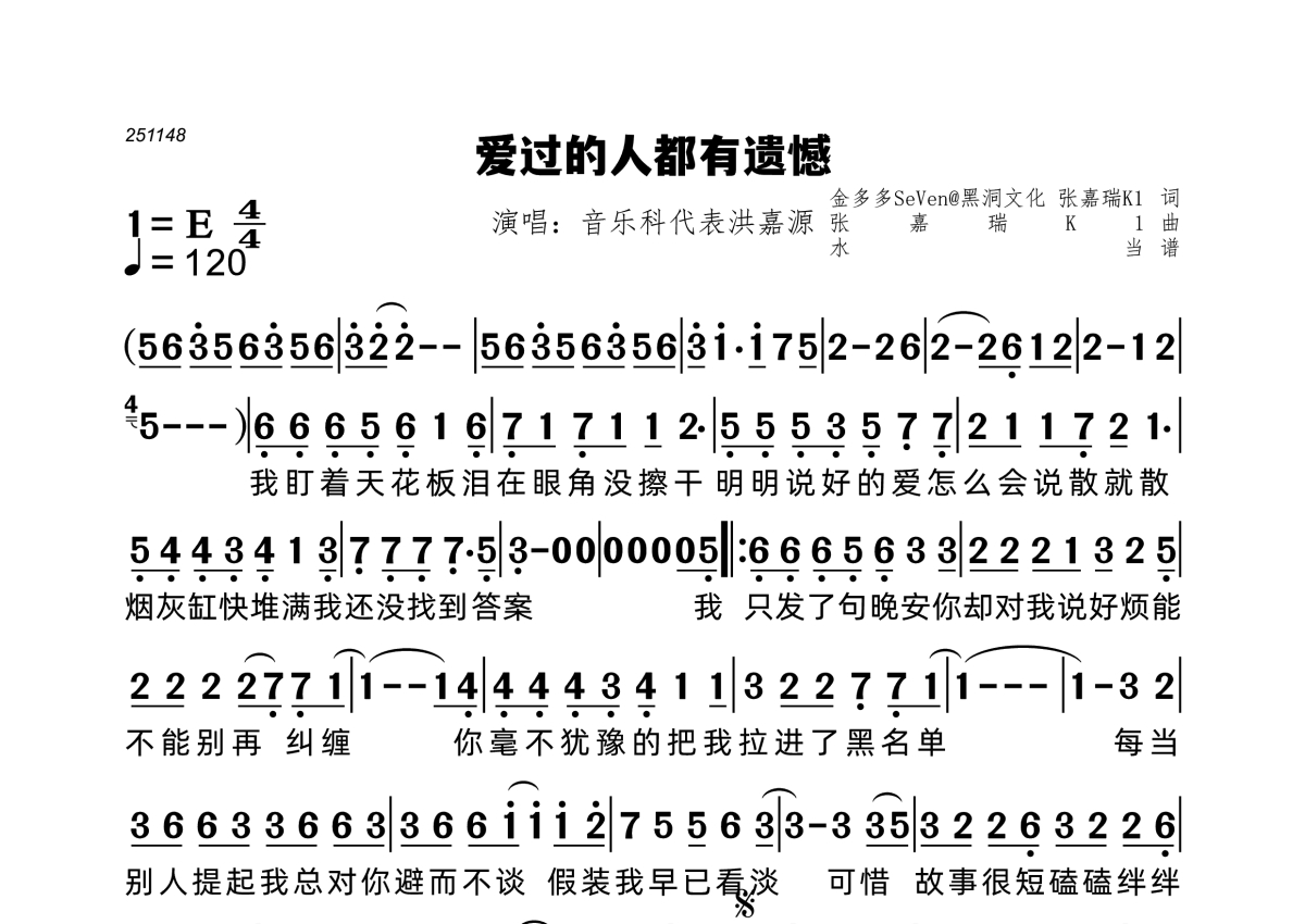 《爱过的人都有遗憾》是洪嘉源演唱的一首歌曲,拍号为4/4拍,歌曲速度为每分钟120拍,这份简谱共有一张高清图谱,图谱由 @水当 编配上传。