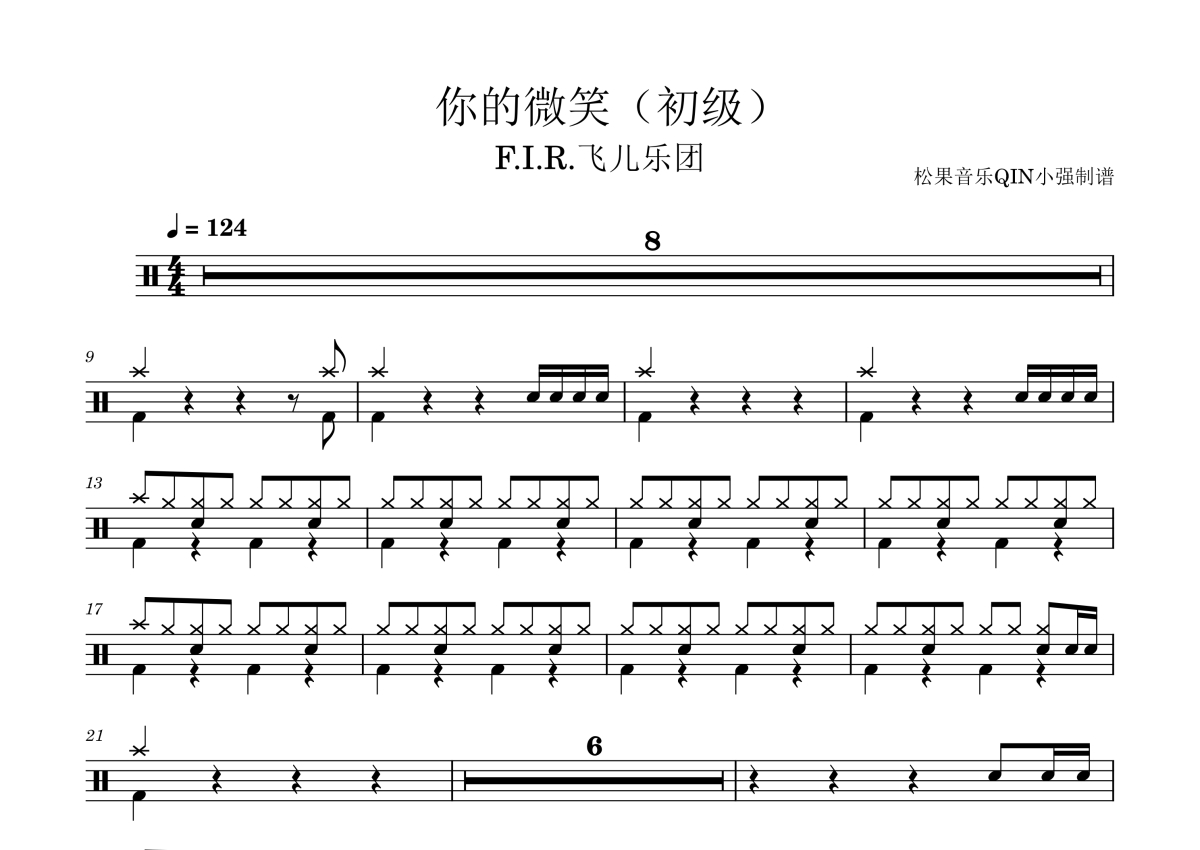 《你的微笑(初级)》是初级演唱的一首歌曲,拍号为4/4拍,这份架子鼓谱共有三张高清图谱,图谱由 @松果音乐QIN小强 编配上传,图谱使用五线谱编配,使用这份你的微笑(初级)架子鼓谱,你将能够轻松地敲打出这首初级的你的微笑(初级),快来尝试吧。《你的微笑》是由F.I.R.、谢宥慧作词,F.I.R.作曲,F.I.R.演唱的普通话歌曲,收录于2004年4月23日发行的同名专辑《F.I.R. 飞儿乐团》中,为专辑第八首歌。该作品时长为4分21秒,由奥斯卡担任编曲,陈建宁与谢文德联合制作,音乐风格融合流行与摇滚元素。